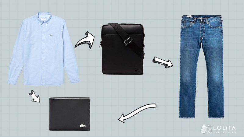 El segundo look representado, está compuesto por una camisa oxford básica de Lacoste. Este tipo de camisas, también presentes en las marcas arriba mencionadas, resultan ser una prenda versátil para utilizar en el día a día o incluso en eventos de mayor formalidad. Como pantalón os proponemos el Levis 501, el clásico, el de toda la vida, el que todos los padres quieren tener en su armario, en difinitiva, el jeans perfecto. Como complementos hemos escogido una billetera y bandolera de Lacoste ya que destacan por su diseño limpio y su piel de calidad excepcional.