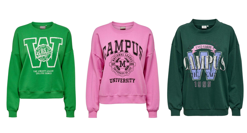 Sudadera estilo Ivy League: La Ivy League es el grupo de las mejores universidades en Estados Unidos. Generalmente con cortes holgados e ilustraciones muy college. Only nos propone varios diseños a un precio increíble de 29.99 euros.
