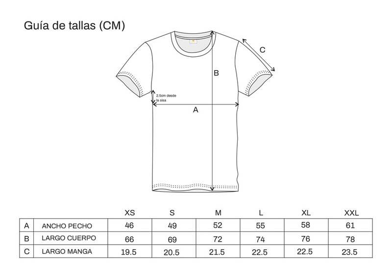 En esta colección cápsula y limitada, tenemos camisetas disponibles en tallas desde XS hasta XXL, con ajuste genderless. Es decir, no tiene género por lo que su patrón está pensado para todos los cuerpos. A continuación, te dejamos una guía de tallas para que elijas la que mejor te queda.